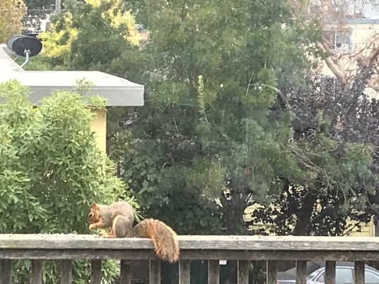 I don’t use species-specific bird feeders, and I put out foods that appeal to all kinds of birds because I have wanted to see what would happen in a free-for-all. But instead of competition, there seems to be a lot of inter-species cooperation. Sometimes the food will sit on the railing for hours, even after it has been ordered up. The birds show up at different times for different treats. The crows love fruits and nuts. The sparrows and towhees eat the millet that has fallen to the floor of the deck. Sometimes, a bird will share the railing with a squirrel, which is pretty funny — the squirrel frantically cramming everything in his mouth and the crow calmly shelling sunflower seeds one at a time. (Like so many urban dwellers, I have waged war with squirrels, but I gave up. Now I love them too.) So far, no evidence of rats. Fingers crossed actually.