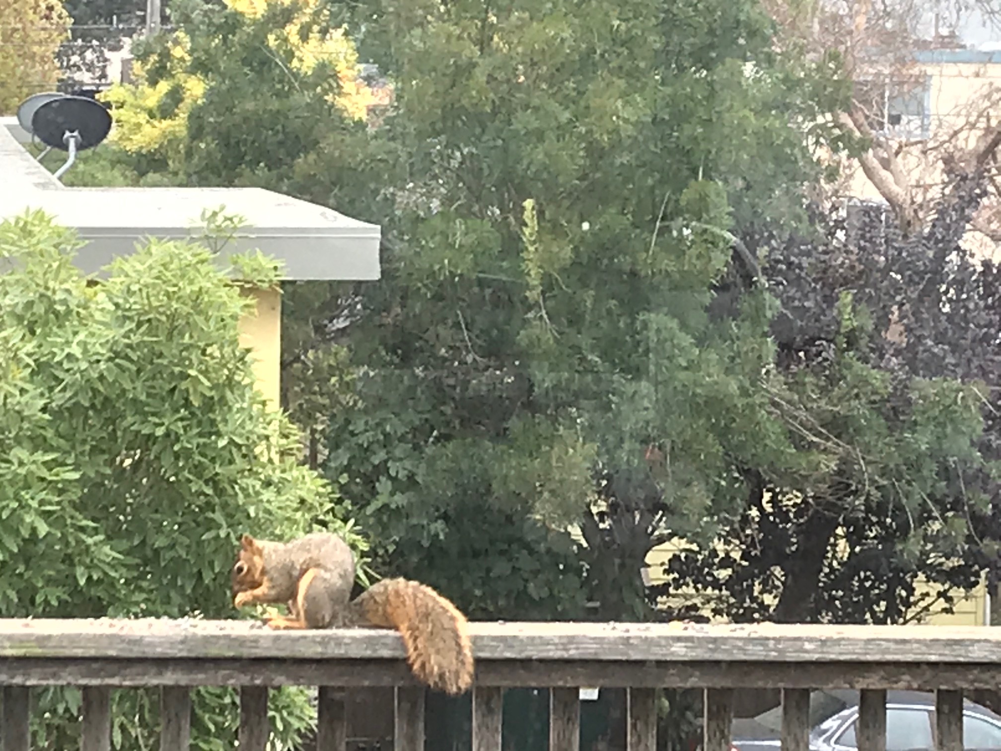 I don’t use species-specific bird feeders, and I put out foods that appeal to all kinds of birds because I have wanted to see what would happen in a free-for-all. But instead of competition, there seems to be a lot of inter-species cooperation. Sometimes the food will sit on the railing for hours, even after it has been ordered up. The birds show up at different times for different treats. The crows love fruits and nuts. The sparrows and towhees eat the millet that has fallen to the floor of the deck. Sometimes, a bird will share the railing with a squirrel, which is pretty funny — the squirrel frantically cramming everything in his mouth and the crow calmly shelling sunflower seeds one at a time. (Like so many urban dwellers, I have waged war with squirrels, but I gave up. Now I love them too.) So far, no evidence of rats. Fingers crossed actually.