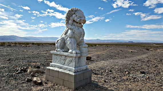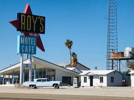 Back on the road, the desert randomly became a canvas for history and a little art. At the intersection of Route 66, I saw Roy’s, a famous icon of California’s mid-century history.