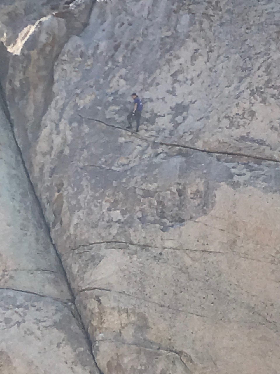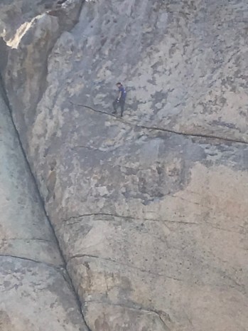 That’s a man up there doing a free climb! This was such a thrill to witness! It was also scary watching the climber inch his way across the boulder’s flat face, using his fingers like claws and his feet like suction cups. I could imagine him concentrating on every inch and half inch of his journey, his life in the balance. This climber with strength and skill and powers of concentration also had the spirit of a performer: when he got to the ledge that transects the center right on the rock, he skipped down it ballet-style and then jumped six feet through the void to a flat-topped boulder. What style! I was his only audience and I applauded, but he probably didn’t hear me. I imagine he was somewhere deep inside himself, overtaken by an adrenalin rush.