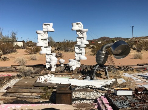 Before I left the area, I got to enjoy another kind of desert art. Not far from the park, out on a dirt road of small stucco houses, is an unusual art installation. The Noah Purifoy Museum is four acres of large sculptures created from the flotsam of desert life, very American. Some are ironic or humorous. Some invite you to rethink the essential nature of cookie sheets or toilets. At first, you assume this is the work of a sun-crazed desert rat, living on cans of Vienna sausages and last year’s oranges. In fact, they are the work of Noah Purifoy, who was once on the California Arts Council and whose work is on display in the Los Angeles County Museum of Art. Purifoy lived in Joshua Tree for the last 13 years of his life.
