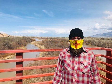 Brad in his flag mask on a bridge over the Rio Grande. He and his wife moved to Albuquerque from Seattle 10 years ago and have a baby named Wyatt.