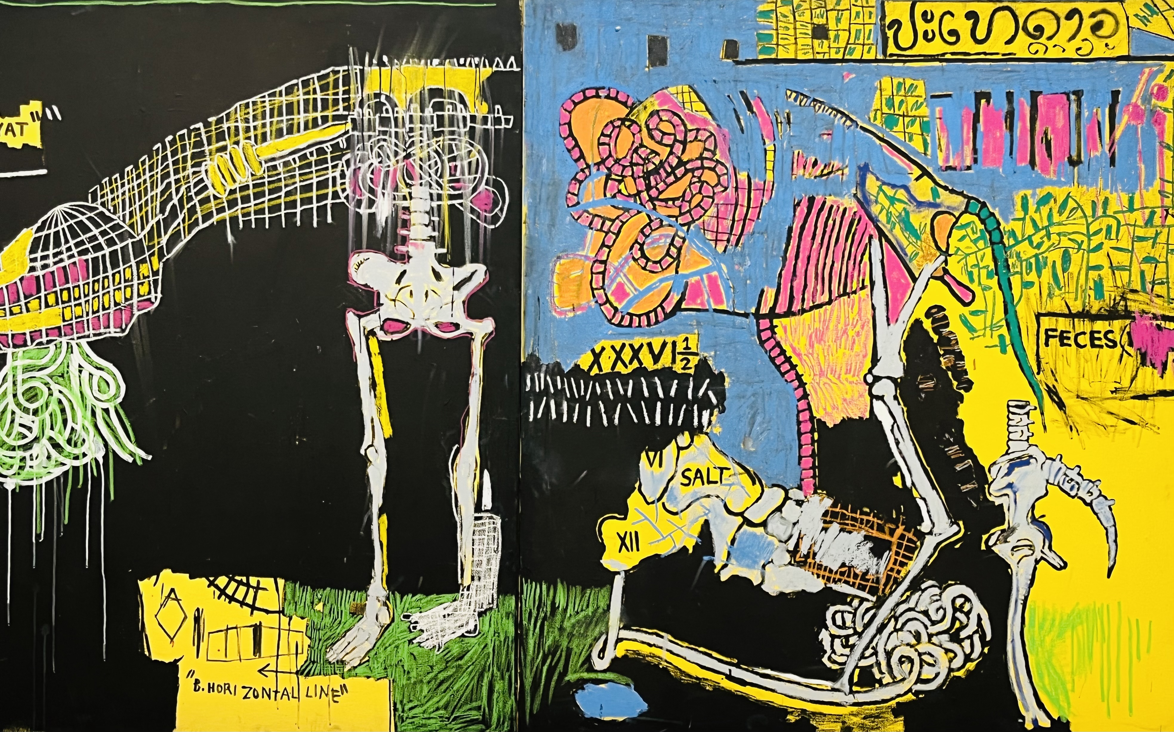 Basquiat’s story is in fact complicated and tragic. Born to a middle class family in New York City, he became homeless at 17. During the time he lived on the streets, he gained some notoriety painting graffiti. At the time, this was a dangerous art form because Mayor Koch directed harsh treatment for graffiti artists. After NYC police beat Basquiat’s friend to death for painting graffiti, Basquiat changed his medium to canvas. He quickly became the it-boy of NYC’s art world and a protégé of Andy Warhol. He painted frantically for 8 years and then died of a drug overdose at age 28.