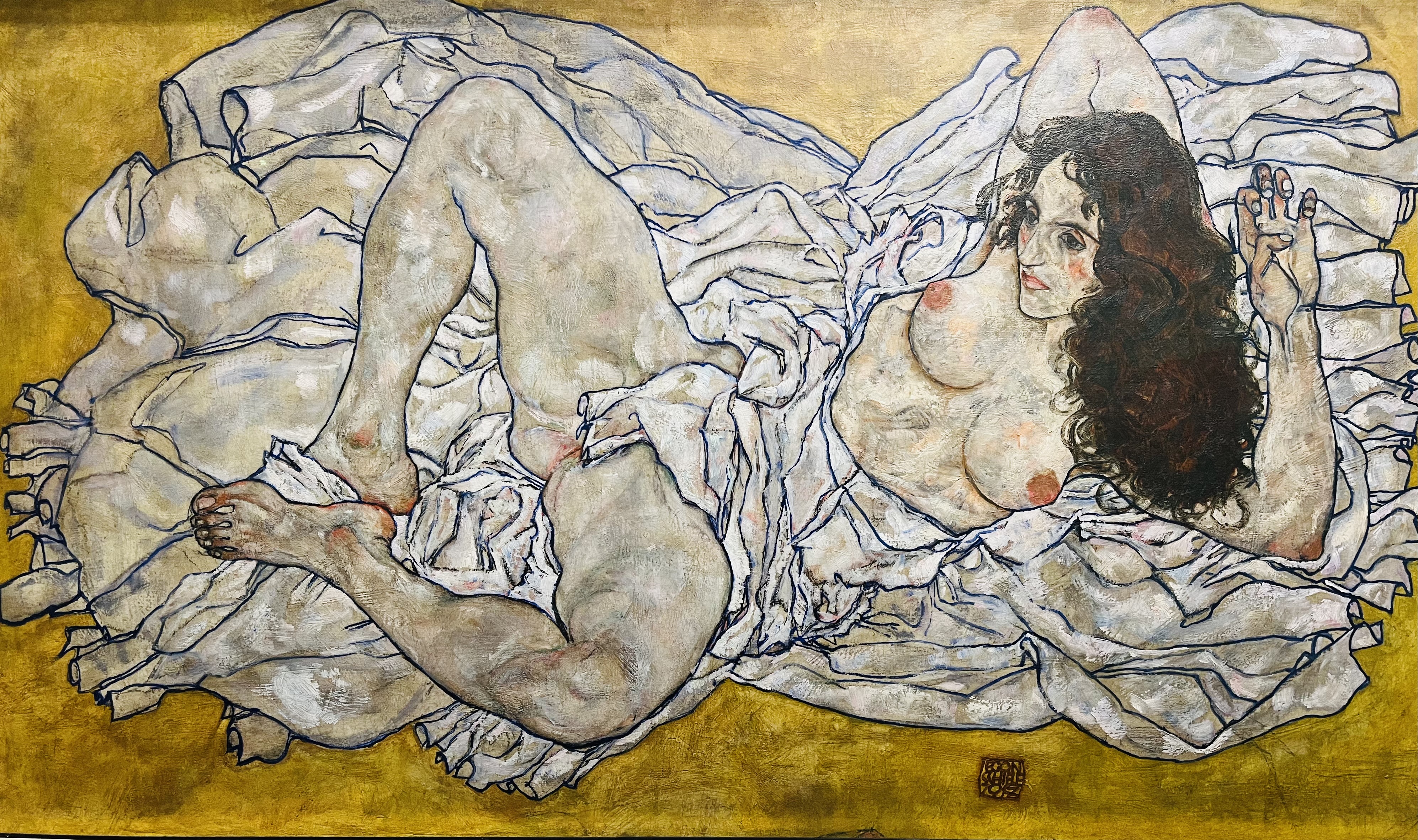 Schiele painted a lot of nude men and women with some very explicit features. The explicit feature on this work was painted over when Schiele decided to enter it into a rather traditional exhibition.