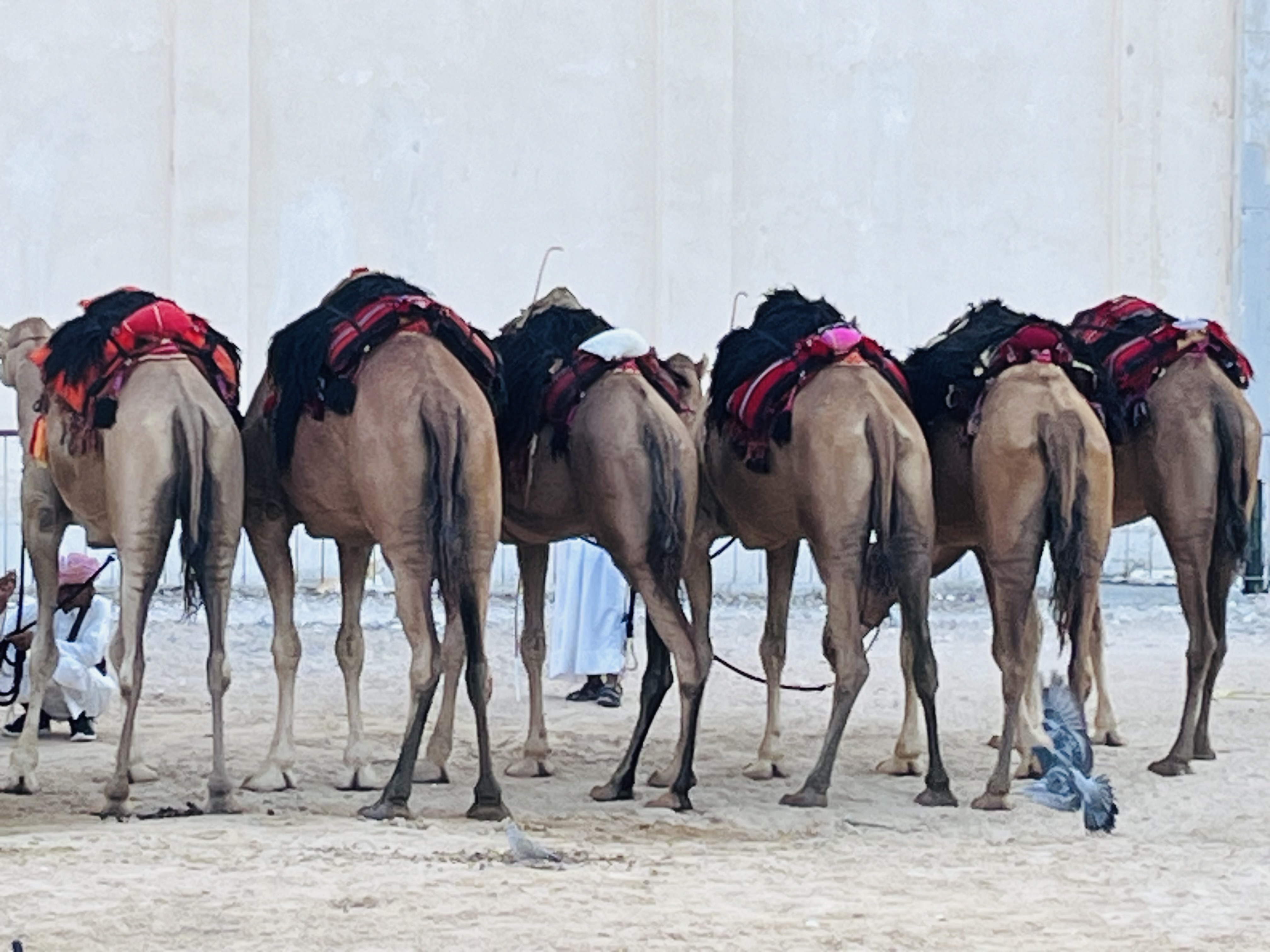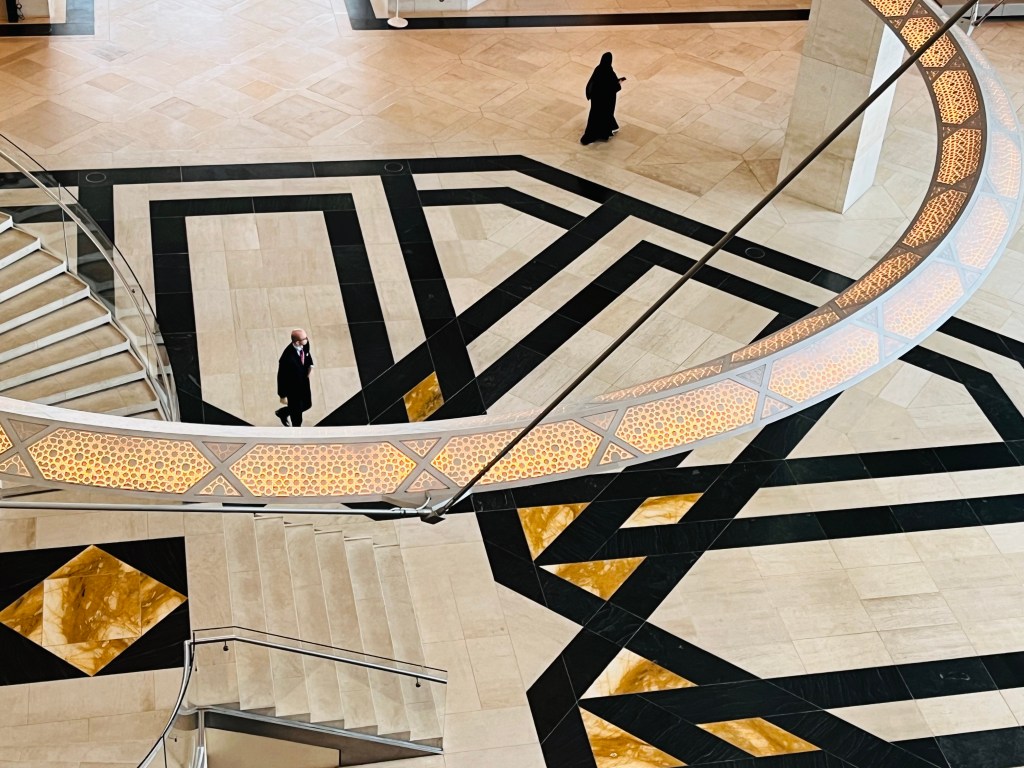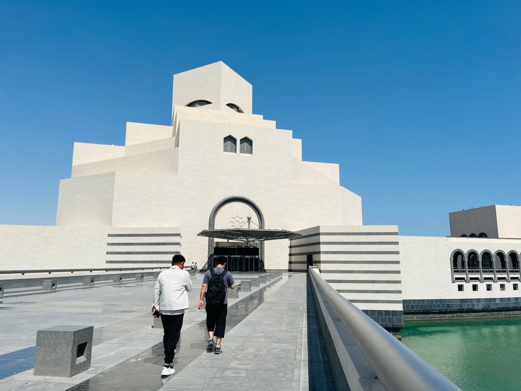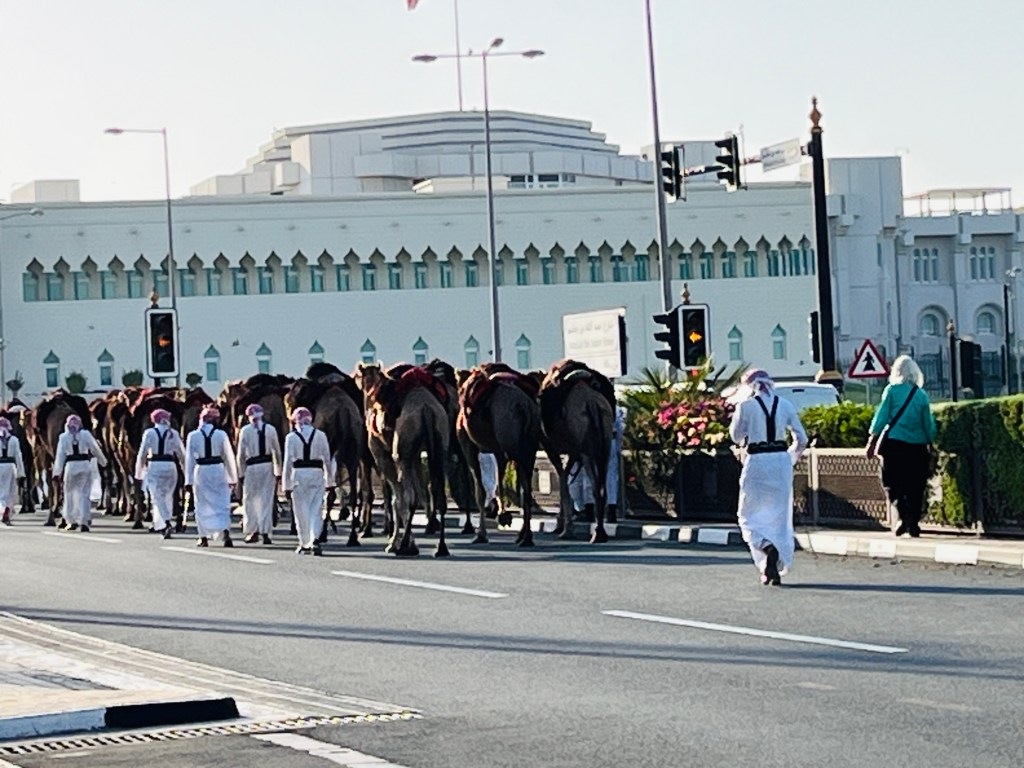 We’re in Doha, the capital of Qatar! In some ways, Doha is like Dubai — a flashy skyline along the waterfront, hot and humid, men in white, women in black (also tank tops and shorts). But Doha feels different, more openly connected to its Bedouin roots than Dubai. There are camels in the center of the city!