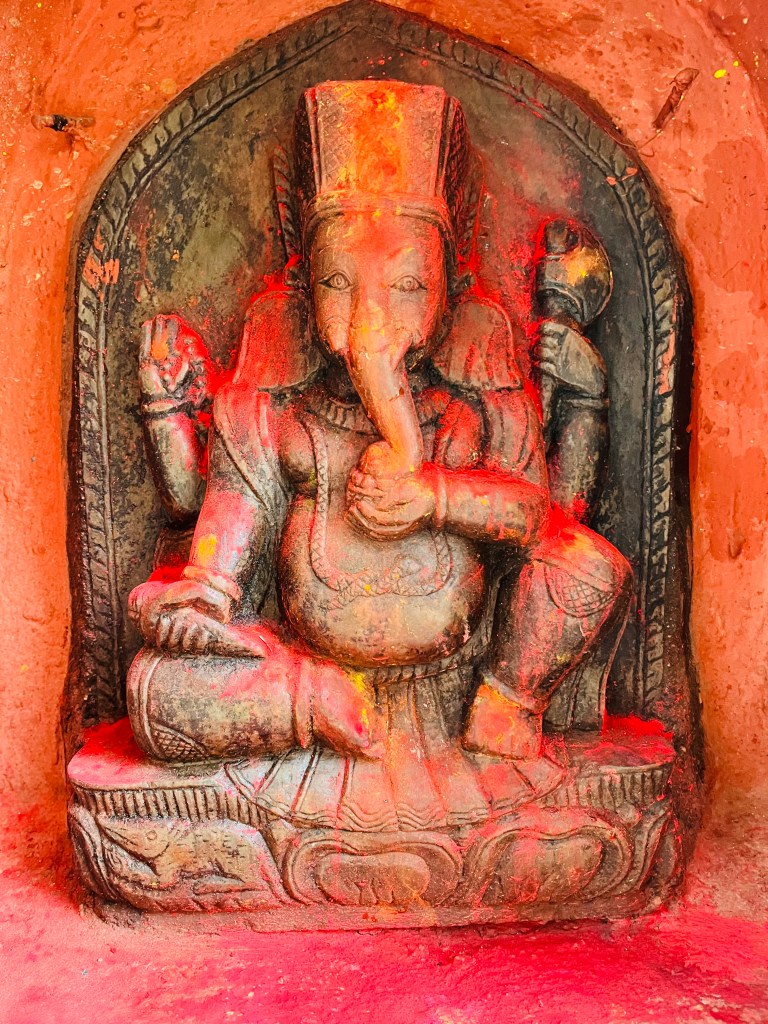 And of course, Ganesh is everywhere, on walls, inside temples, at little altars on the streets, even in Thamel. His likeness is often dusted with chalk — red for passion and purity. I asked Aparna why Hindus love him so much. She said, “I think it’s because he wants us to be happy. And he has big ears and a long nose so he listens more than he speaks.”