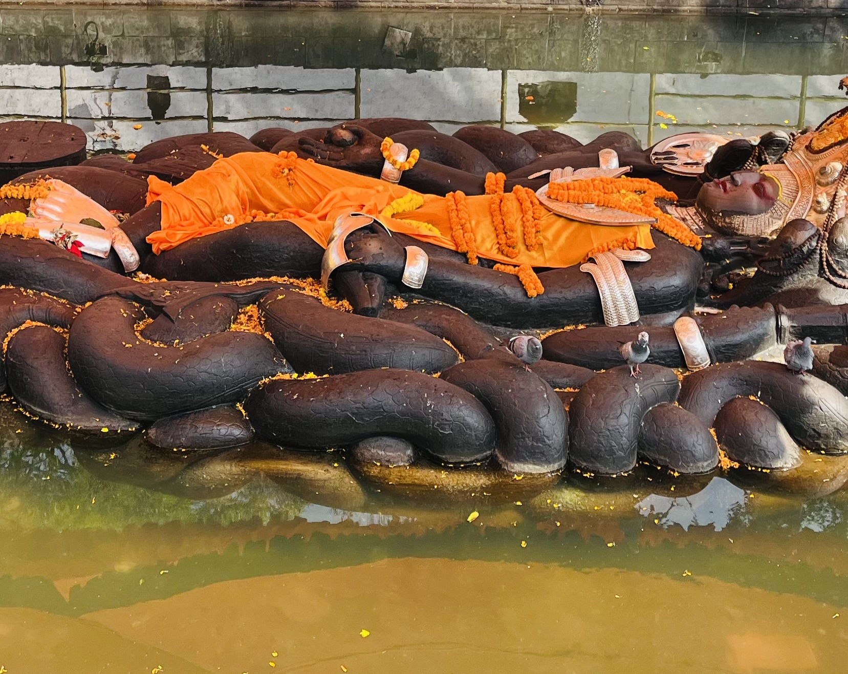 We also visited Budhanilkantha, a village just north of Kathmandu and the site of a wonderful sleeping Vishnu floating in a pond. The sleeping position represents the state of cosmic rest between creation and destruction. Found buried by a farmer cultivating his land, the statue is 15 feet long and carved from a single block of basalt. When I visited 15 years ago, the village was nearly empty except for a group of boys playing soccer with a flattened ball. (I got them a new one at a little kiosk, which they immediately sold so they could buy candy 🙂 ). This time, Budhanilkantha was busy with shoppers, pilgrims, and people just being with the Sleeping Vishnu.