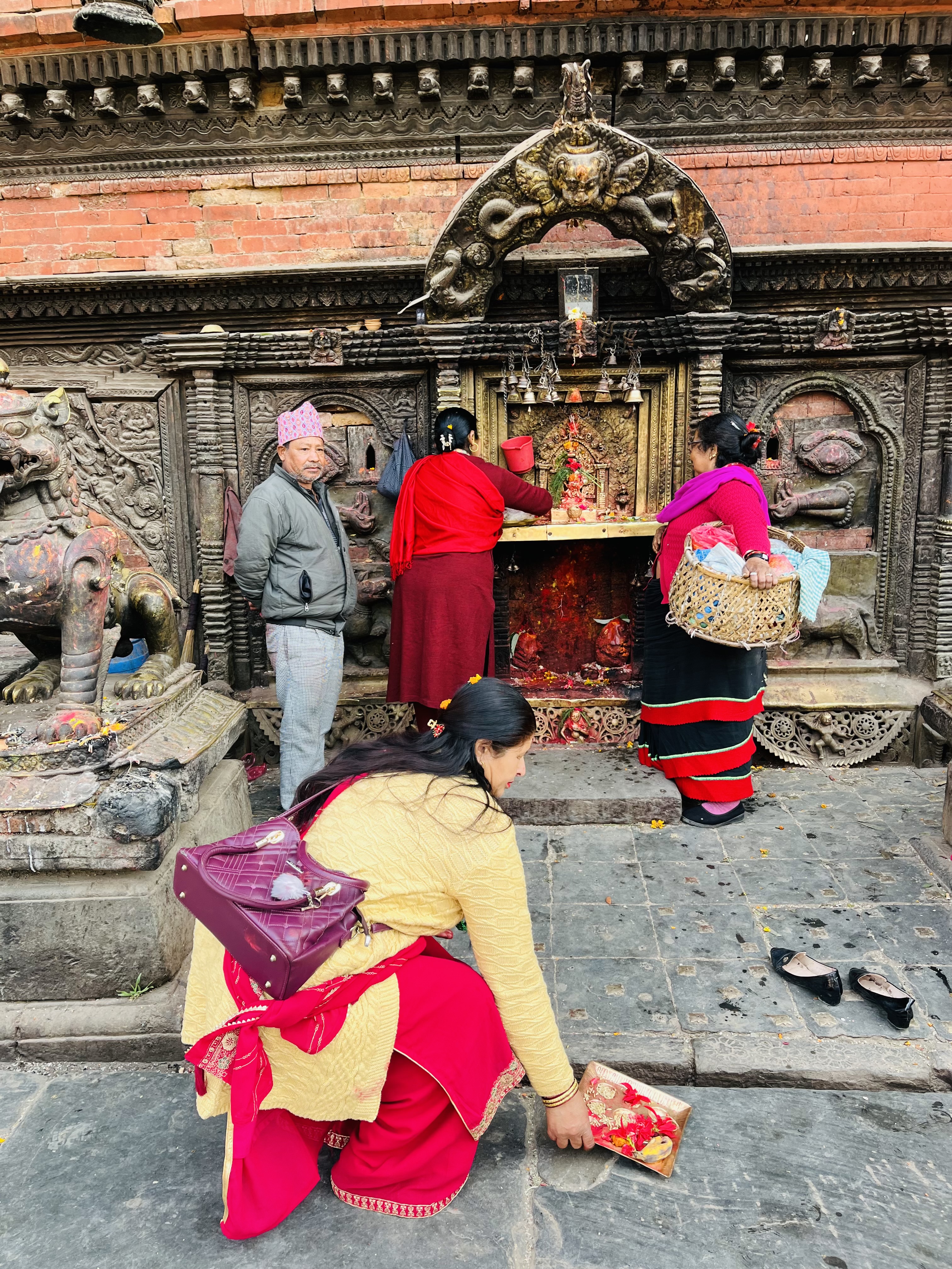 My last day in Bhaktapur was Shivaratri, a Hindu holiday celebrating the wedding of two powerful gods, Shiva and Parvati. The day is considered a time when cosmic energy aligns with Shiva’s essence — destruction and creation. It’s a day of praying and meditating. As I passed the small outdoor temples around town, Hindus made offerings of marigolds, candles and incense.