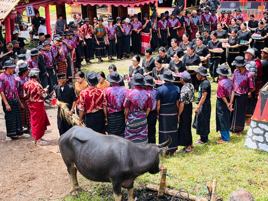 Before burying their dead, the Toraja conduct elaborate funerals where a few or hundreds of community members show up for two days of feasting, testimonials, music, and the ritual slaughter of buffalo and pigs. The wealthiest families slaughter 24 buffalos for the event, and distribute the meat to the community. We went to the funeral of an important local man. The event took years of preparation, requiring the construction of several temporary buildings. It featured several processions and traditional dancing by dozens of women and men. We left before the animal sacrifices.