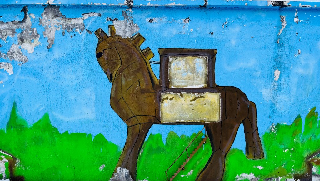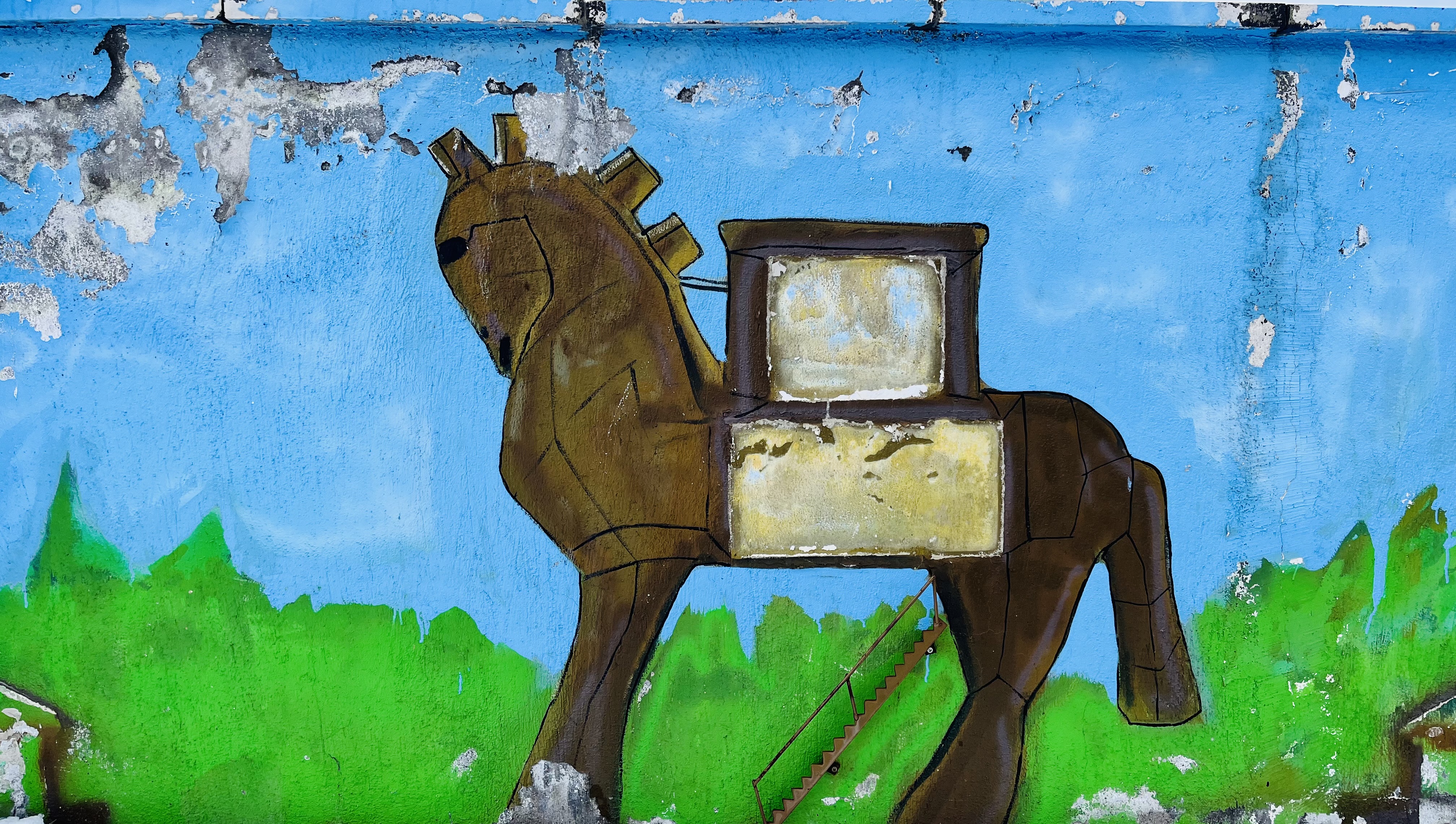 You can ride a horse like the one on this mural near the caves (but avoid the horses carrying vintage televisions).