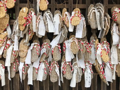 Raffia woven sandals cover a temple wall representing the strong legs we will need for the journey of life.