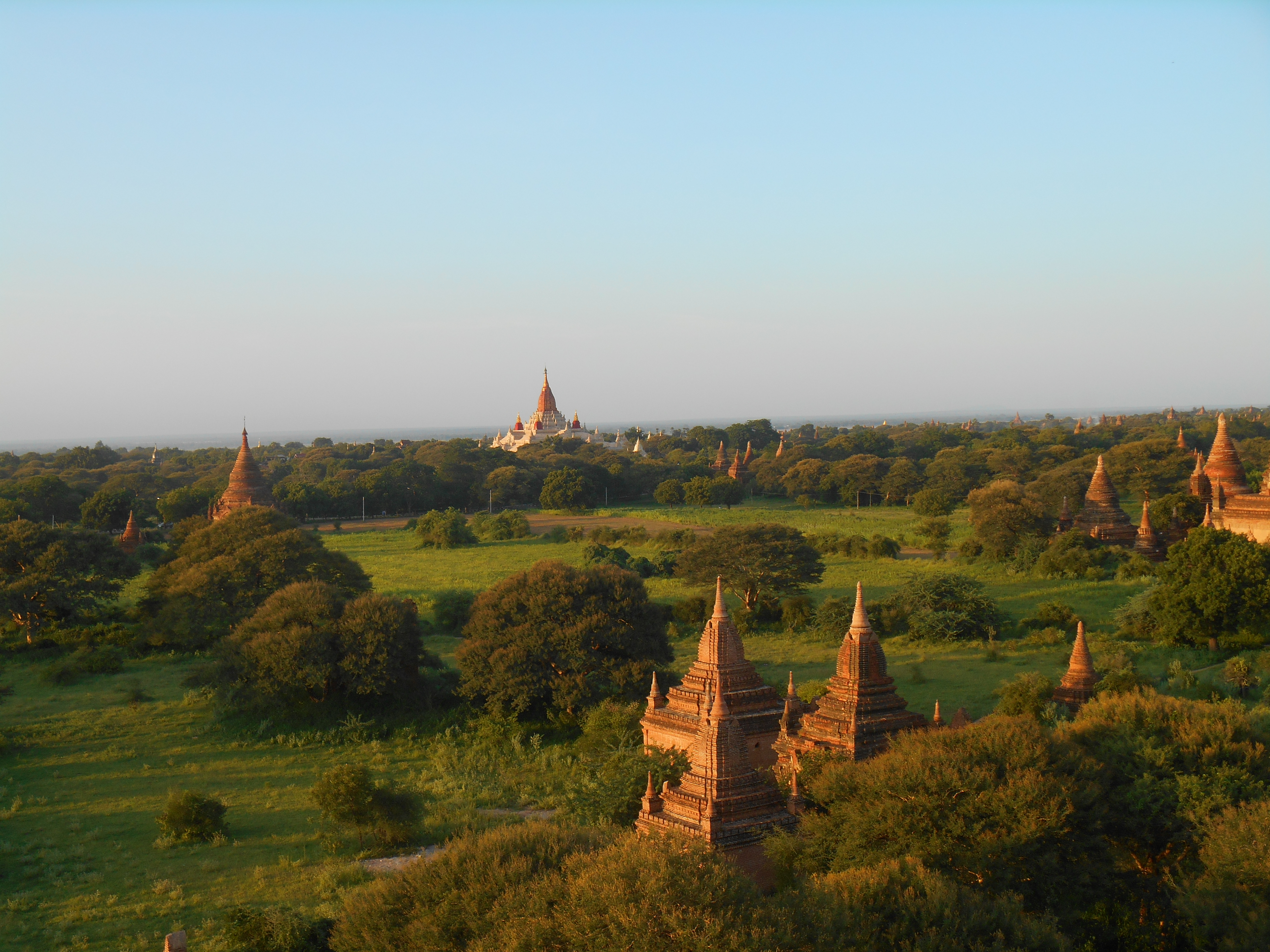 We arrived in Bagan by way of a four hour, somewhat bone-jarring back road drive from Mandalay. The drive gave us a view of the gorgeous Burmese countryside — carts pulled by horses and Burma cows, herds of long-eared, black-headed goats, and thatched houses along mile after mile of bright green farmland.