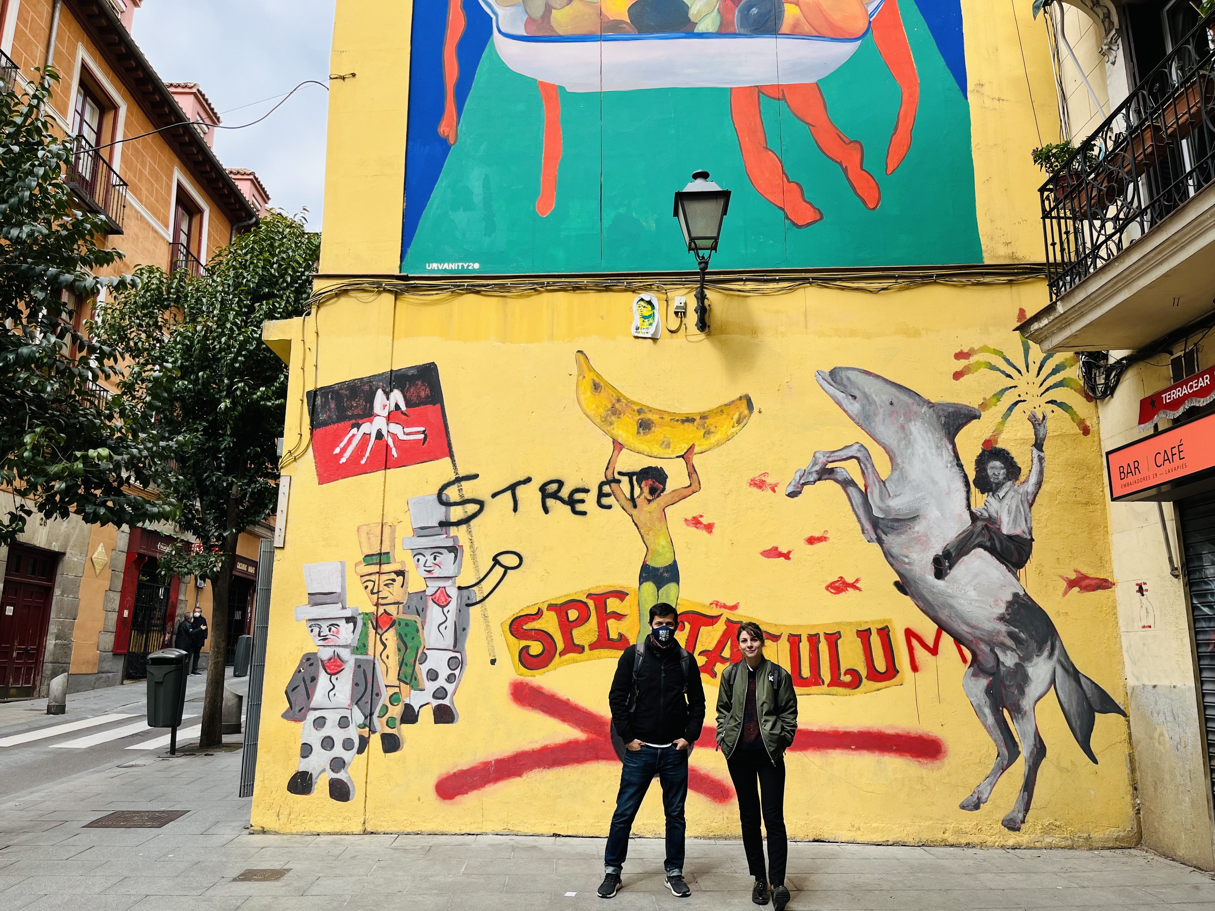 On Friday, I went on a walking tour to see the murals in the neighborhood of Lavapies with Mimi and Gerardo, both artists themselves. I loved the mural behind them for its playfulness. You can see the reference to Matisse’s dancers in the top mural. Below, the mural is taking a poke at itself: the word “Spectaculum” means a place of entertainment and refers to the way street art can gentrify a neighborhood. So far, Lavapies retains its international not-gentrified character, and is full of immigrants from all over the world with a very strong sense of community.